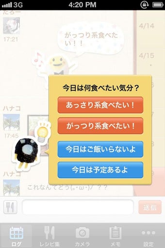 アプリのチャットではテキストメッセージのほか、テキストボックス左のアイコンをタップすれば「今日は何を食べたい気分?」「今どこにいるかな?」などの質問が表示されるので、気分に合うものをタップするだけで「和食食べたい」「会社出たよ!」などの定型文をかわいいキャラクター付きでメンバーに送れます。作成したメッセージは LINE やメールでも送れるので、ごちレコ以外のユーザーともシェアできます。
